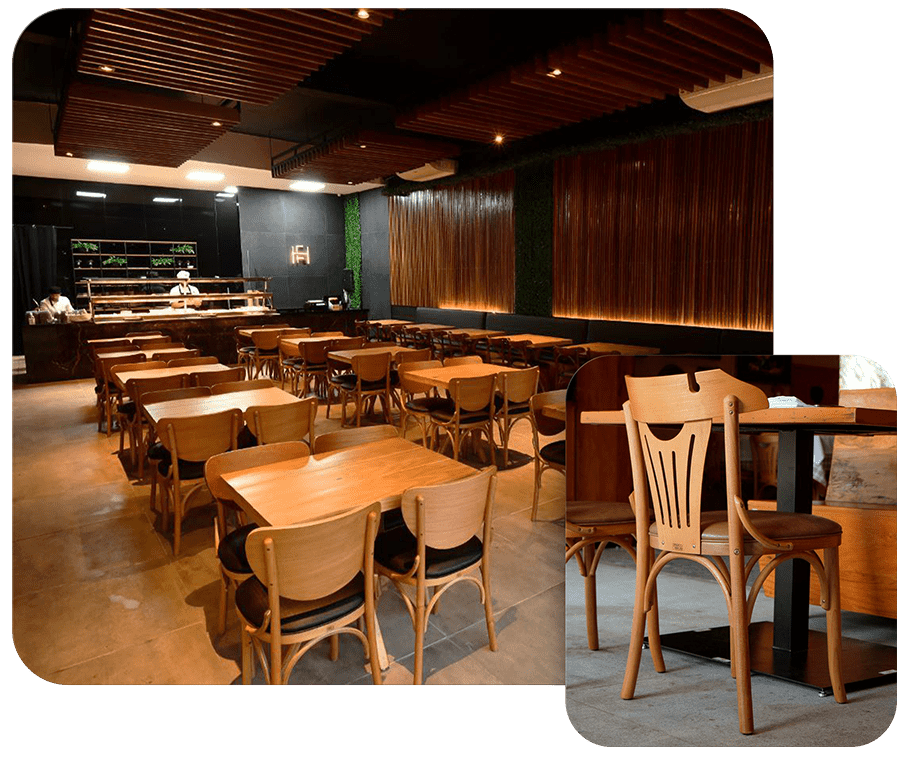Peças únicas que valorizam o ambiente do seu restaurante, com ergonomia, acabamento de alto padrão e madeira de origem legal
